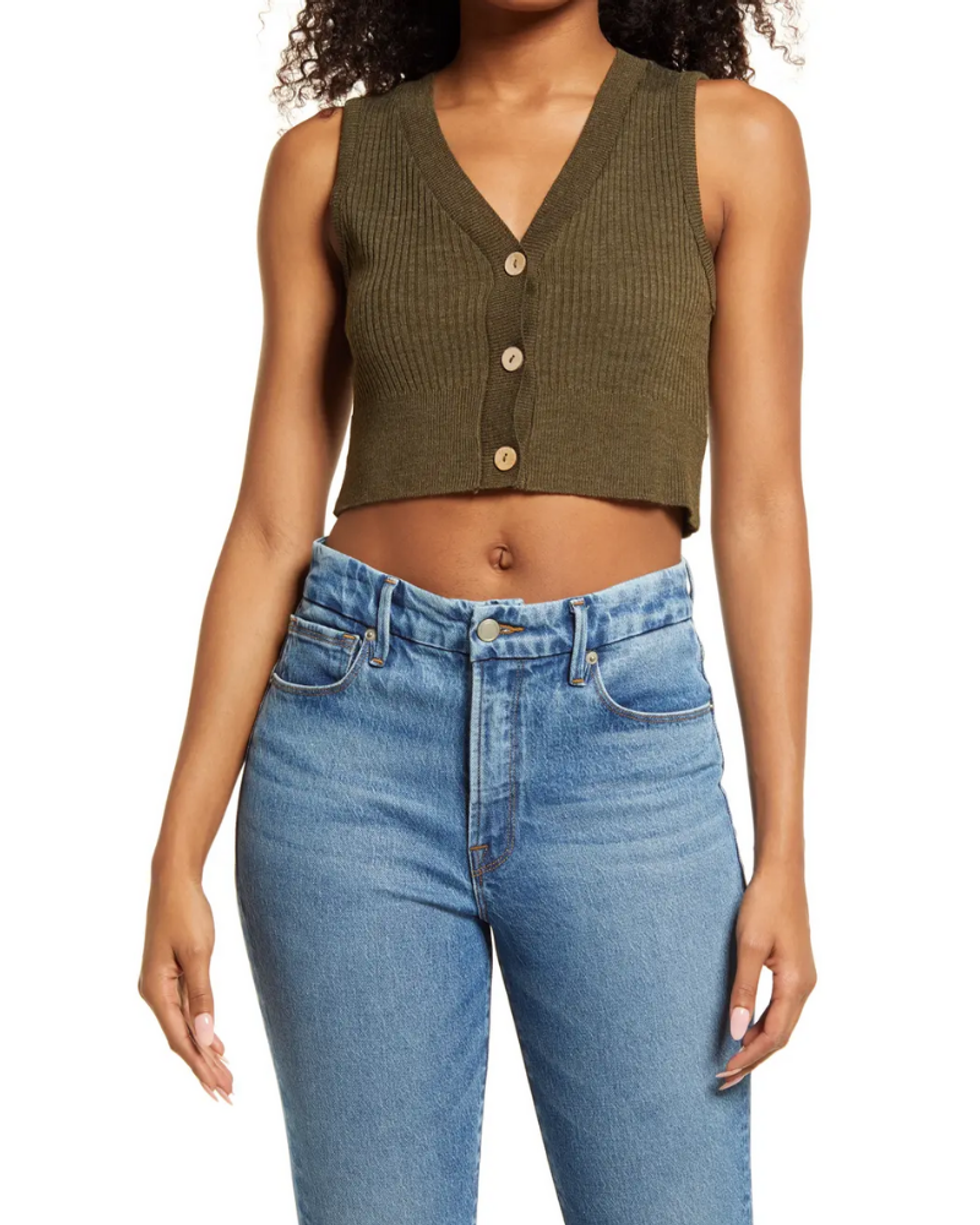 Add a new hue and a cropped style to your sweater vest selection and pair with jeans or shorts for a simple end-of-summer outfit.