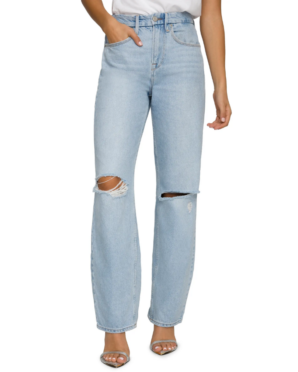 Look to Good American for a perfectly worn-in pair of wide leg jeans—the ideal, breathable denim trend for summer.