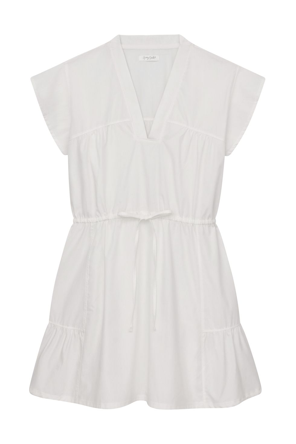 A casual dress with elevated details — this one features a bow at the waist — means that you'll be comfy and feel cute. Rainbow shoes add a pop of color, and a roomy, structured tote provides ample room for your laptop. Don't forget to protect your face on the trip there and back with a visor or sun hat!