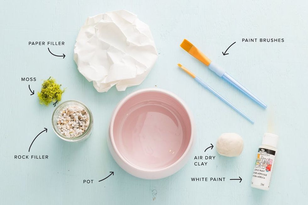 - Fill your pot with paper filler and then cover the top layer with the rocks. Set in the faux coral and embellish with the moss.