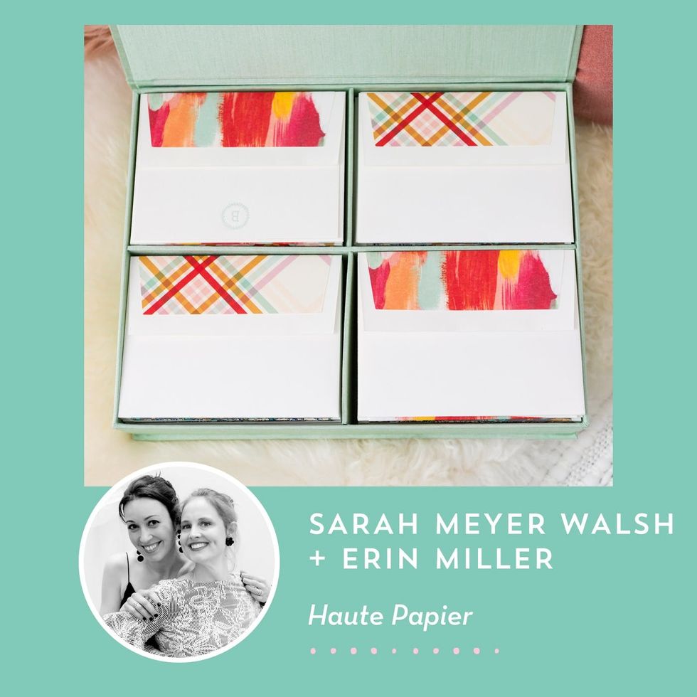 Armed with an ever-growing fleet of presses, Haute Papier owners Sarah Meyer Walsh and Erin Miller are committed to designing fresh and beautiful stationery, executing exceptional printing, and providing quality customer care. The duo has worked to grow their products' reach to over 1,500 stores around the world and is renowned for their creative talents, always pushing the envelope in business and design ;) Shop their readymade and custom paper products here at the Haute Papier Etsy shop.