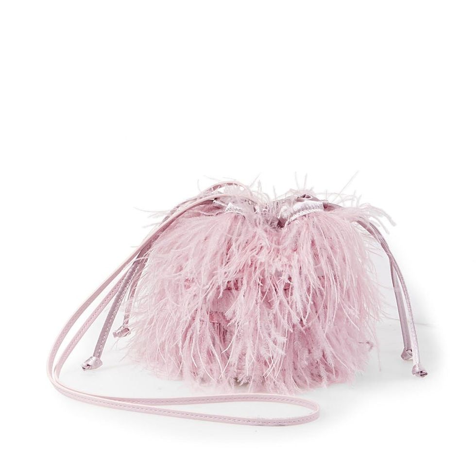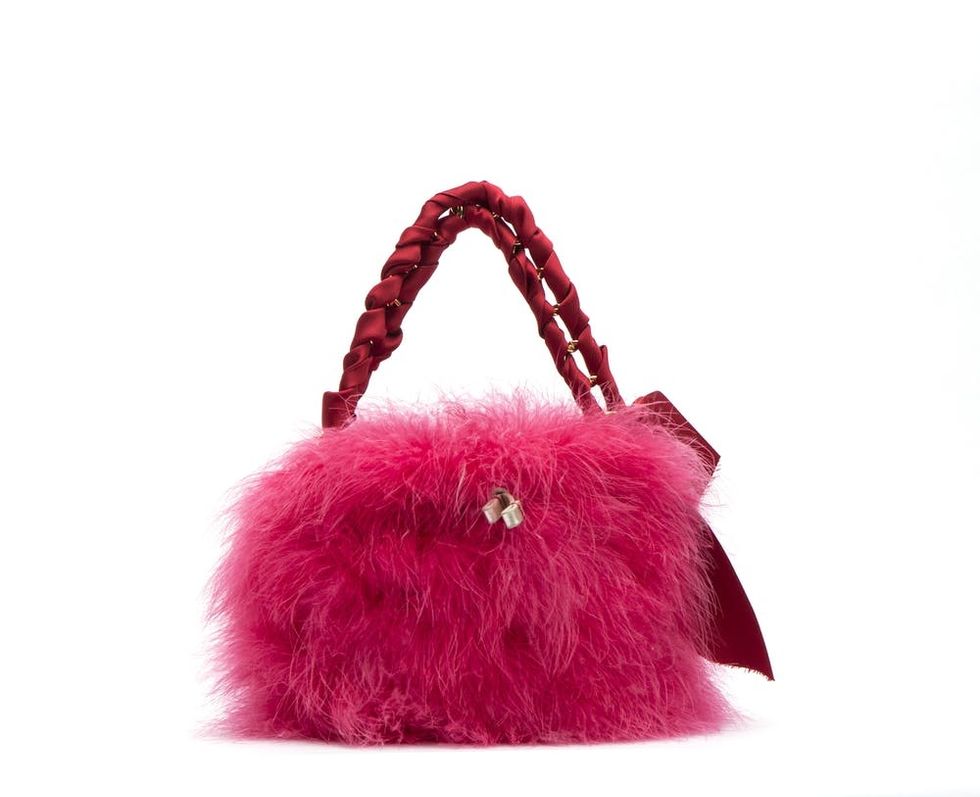 This marabou feather bucket bag with satin-wrapped handles is just the splash of color needed to brighten up winter’s gray days.