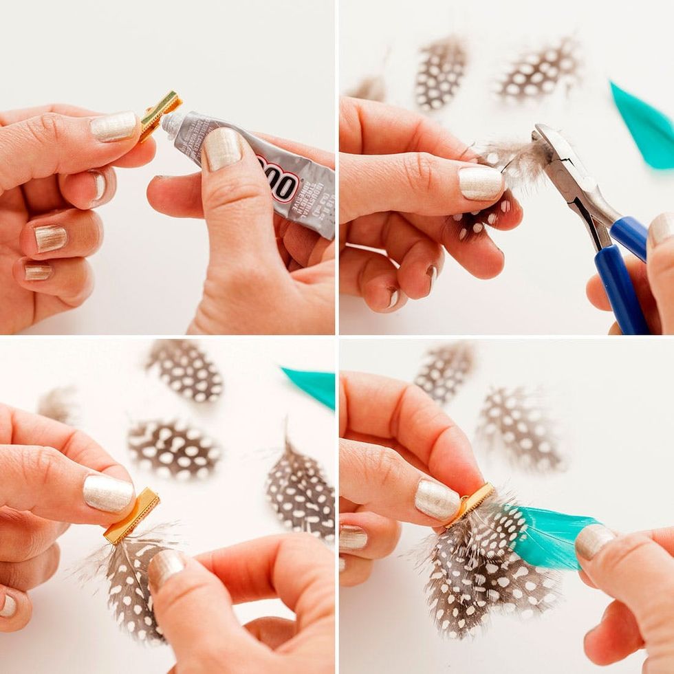 Grab your cord end and squeeze some E-6000 into the fold. You don’t need to fill it up — a thin layer of glue will suffice. Trim the stems if they are long and place your feathers into the cord end. We found these gorgeous feathers at our local fabric store Britex, but you could be adventurous and gather fallen feathers (just be sure to wash them — pretty sure those birds weren’t lathering up with coconut body scrub on a daily basis) or get them from a fly fishing shop.