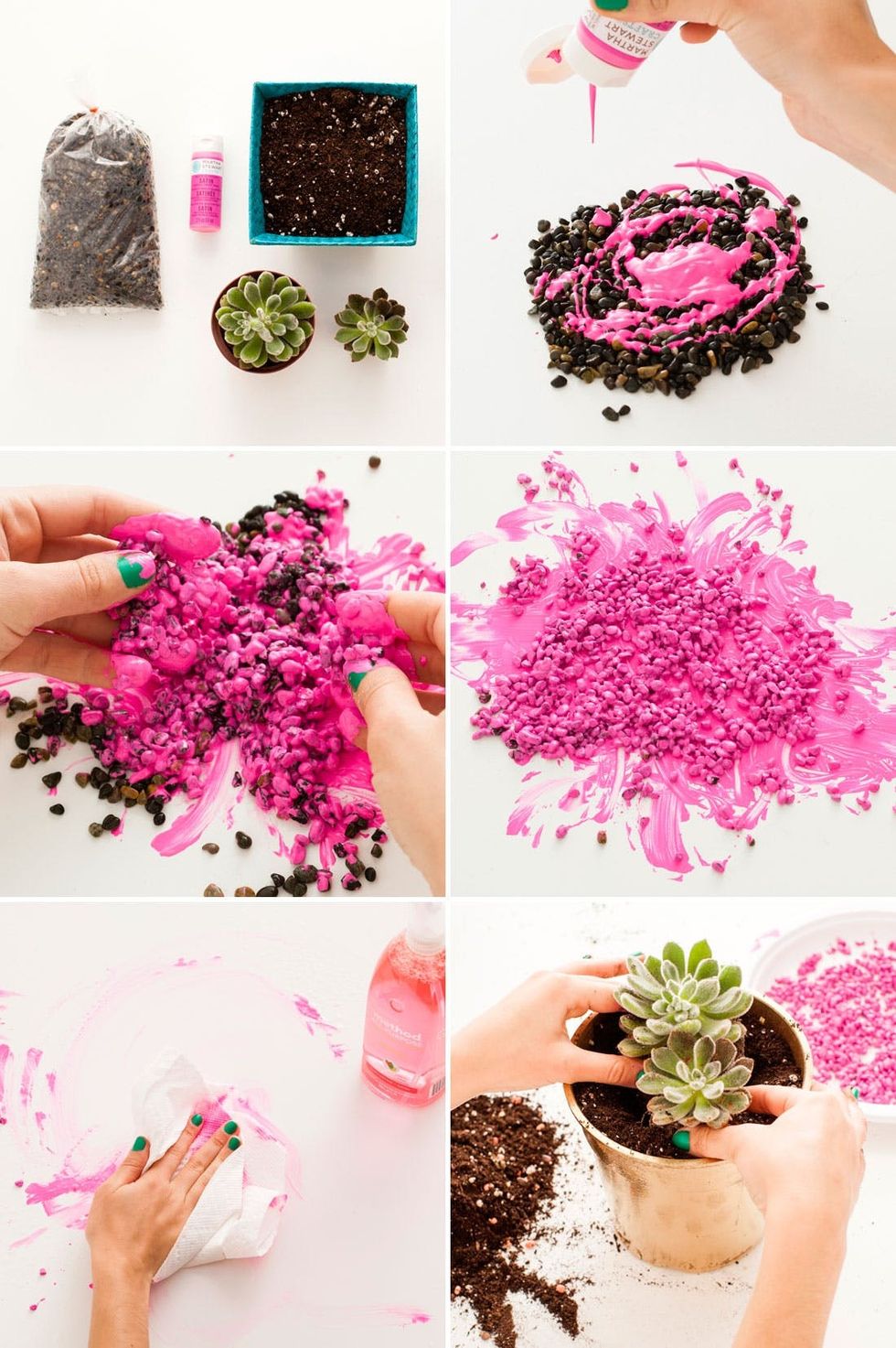 1. Throw Unexpected Pops of Color into Your Planters: First off, you have to get some flora on that table. If you’re like us, you have a few succulents hanging around your apartment. Add some pep to them by painting rocks and pebbles in vibrant colors. Then adorn your plants with them!