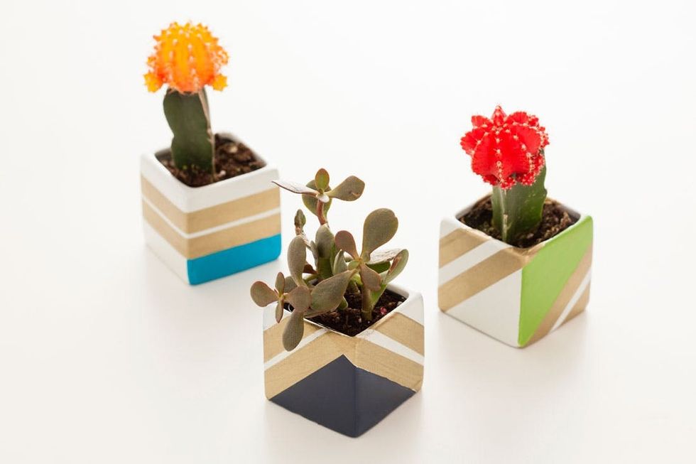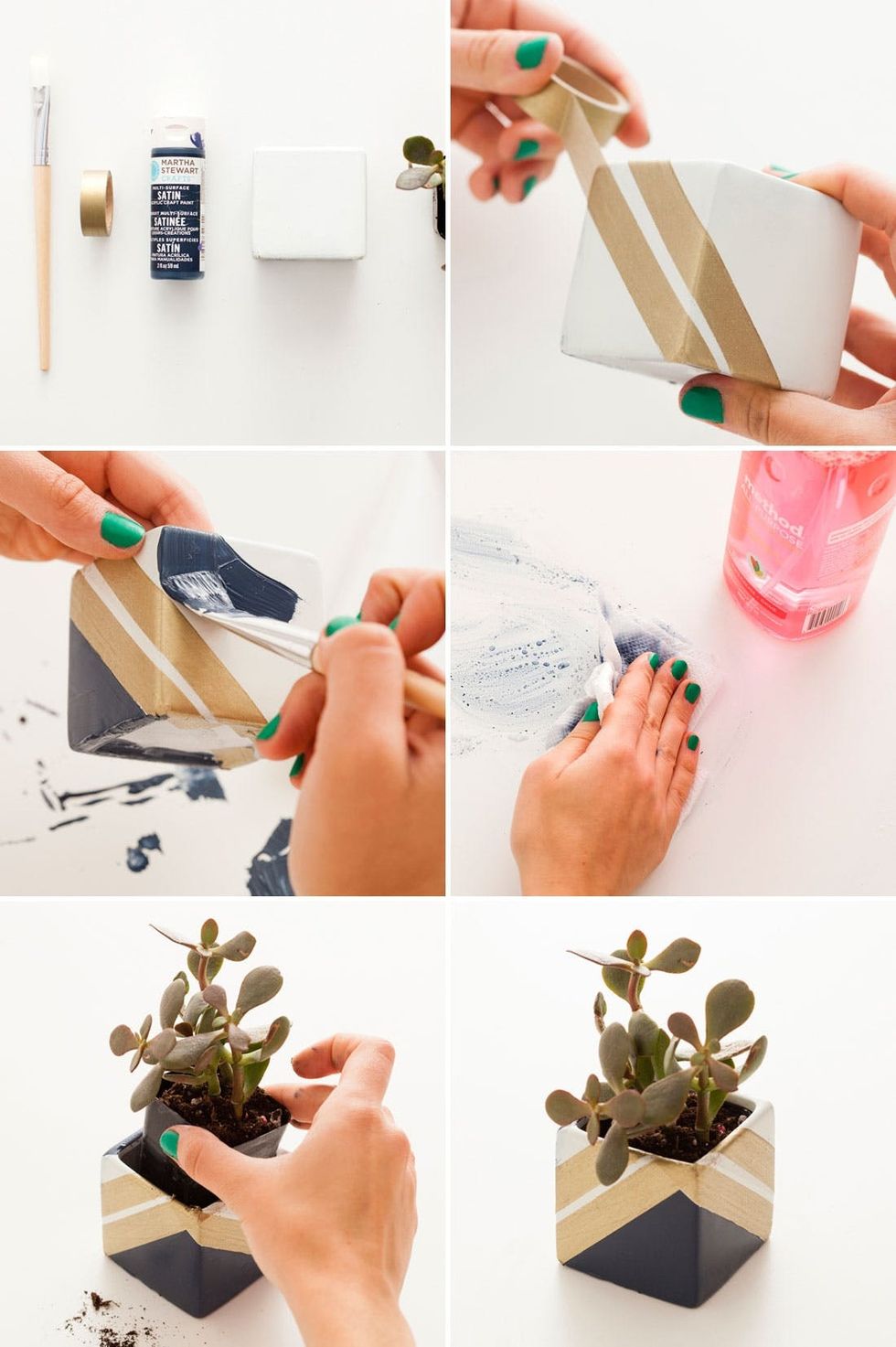 6. Add Blocks of Gold and Color to Square Vases: For another way to amp up the greenery you’ve got on deck, try color blocking mini white vases. We used gold tape to create gold stripes and acrylic paint for a blast of color. As always, keep Method All-Purpose Cleaner on hand to keep your workspace tidy.