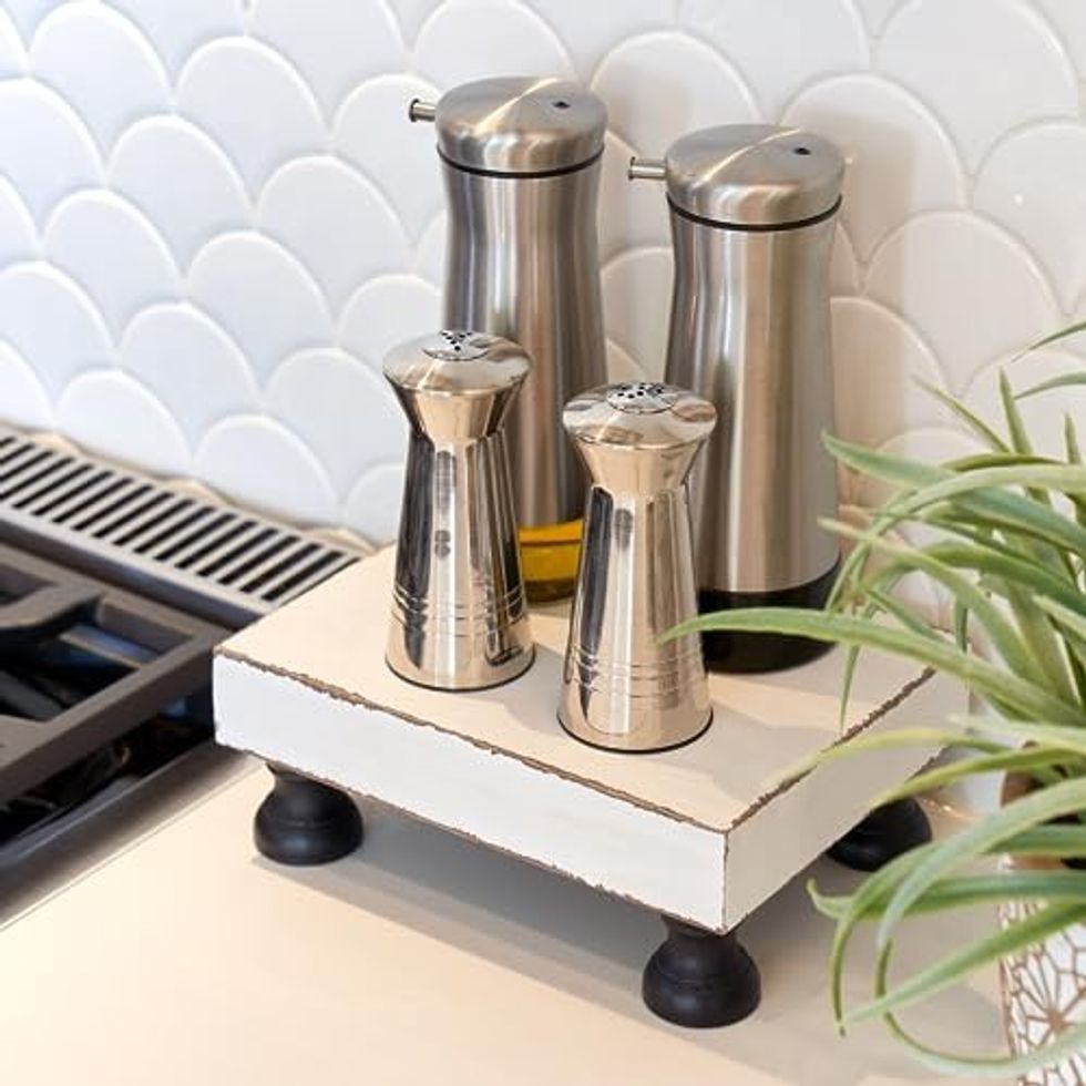 Enrich your decor with versatile wood riser, a charming addition to any farmhouse or rustic-themed space. Crafted from sturdy wood and featuring a distressed white finish with black wooden feet, this riser adds a touch of vintage appeal to your home. Use it as a unique centerpiece on your dining table, a decorative pedestal stand for various items, or a functional organizer in your kitchen or bathroom.