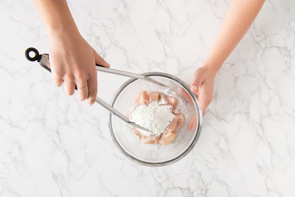 Season PERDUE® FRESH CUTS™ DICED CHICKEN BREAST with salt and pepper, then coat it with cornstarch.