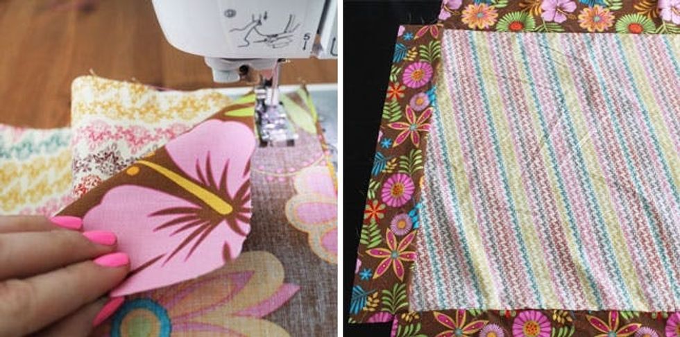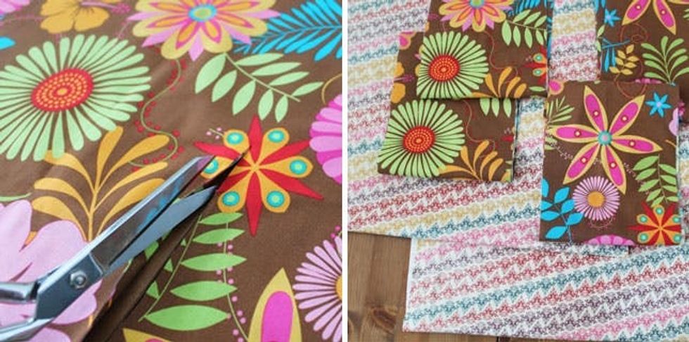 As with any sewing project, the first thing to do is cut your fabric! Cut 2 squares that are 36 inches by 36 inches. Then, with a complimentary or matching fabric, cut 4 pieces that are 36 inches by 7 inches. Lay everything out before you get on the sewing machine to make sure all your pieces fit together.