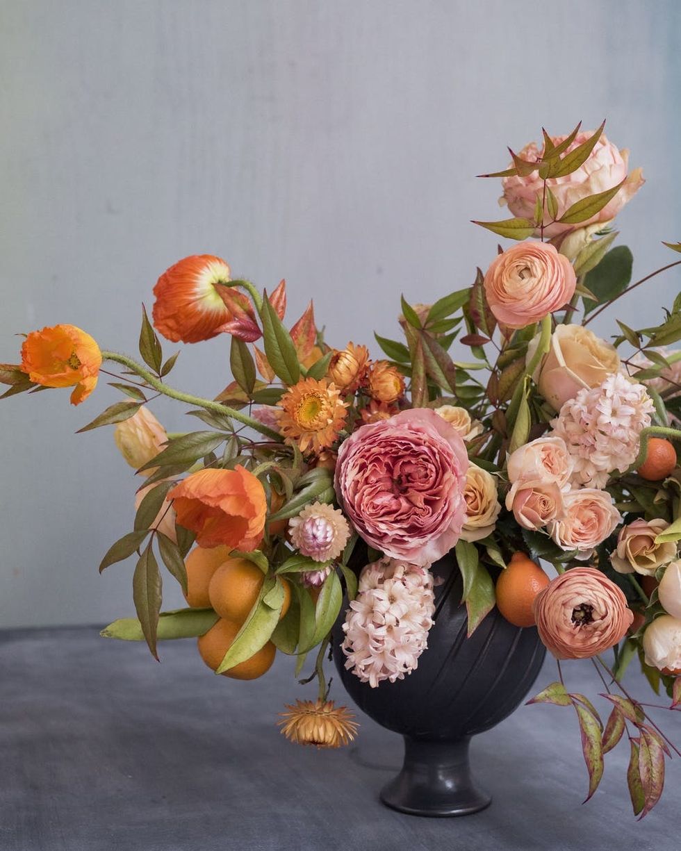 2. Vary your textures. We all have a favorite flower (Underwood’s is ranunculus, for its wide variety of colors and whimsical stem shapes), but the best compositions keep things interesting with many different types of flora. “Purchasing the best possible variety of flowers that I can afford allows me to be more creative than if I have to work with a very limited variety,” says Underwood. “A variety of textures, sizes, and shapes will allow you the most latitude to create something wonderful.” Browse at a floral market or shop for inspiration, and see what you’re naturally drawn to!