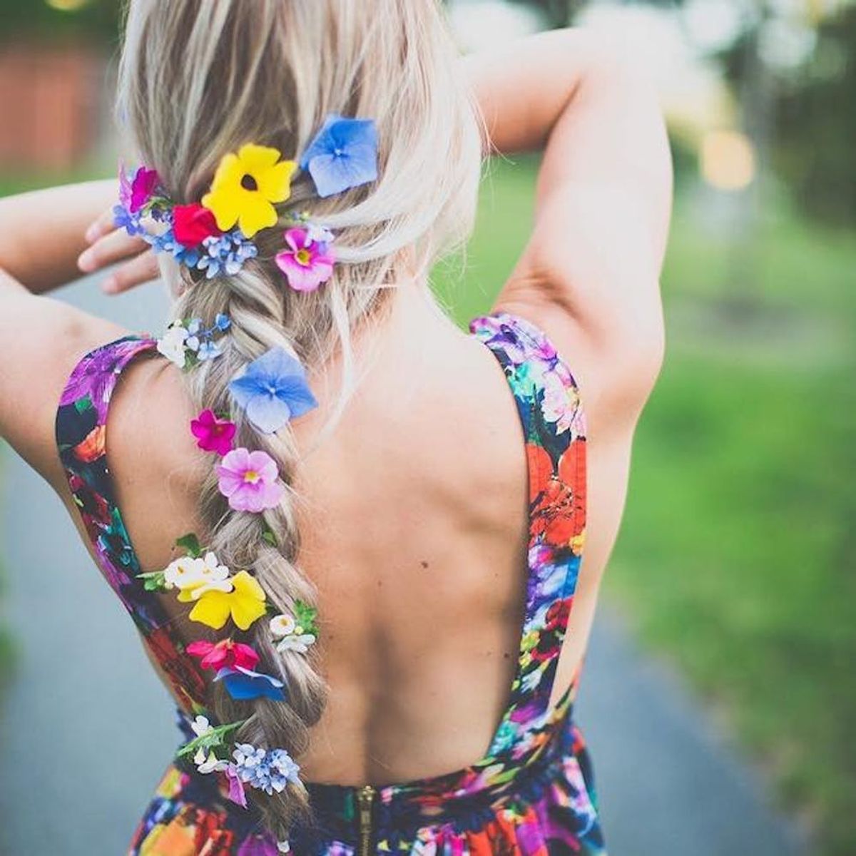 2. Rainbow Flower Braid: Incorporate a variety of different-colored blooms for a whimsical effect. Think: Rapunzel’s magical flower-embedded braid in Tangled.