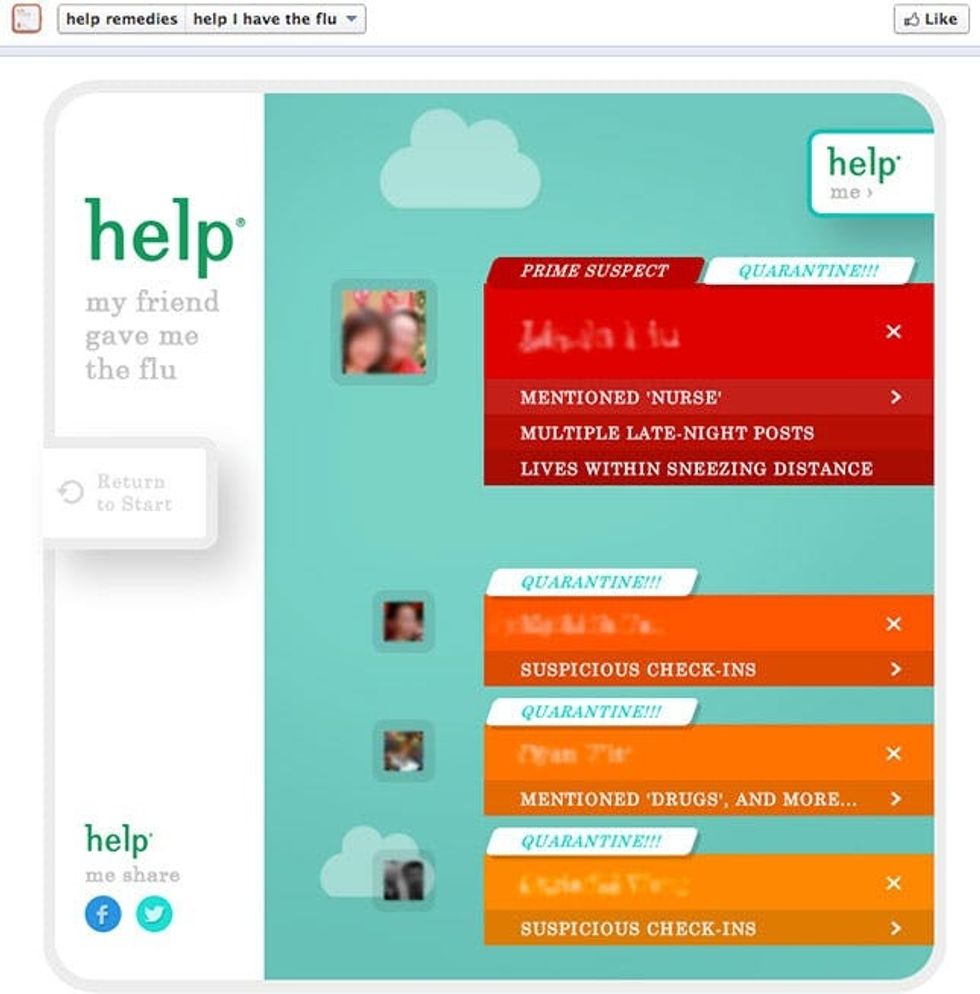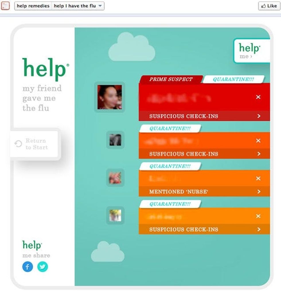 We also experimented with the option for “who might give me the flu.” Interestingly enough, the results were a little different. Either way, we’re staying far away from ALL of the suspects! If you feel the symptoms of the flu already, it gives you the ability to message the sick person, or go directly to the Help Remedies website to purchase medicine. Very clever marketing scheme, indeed.