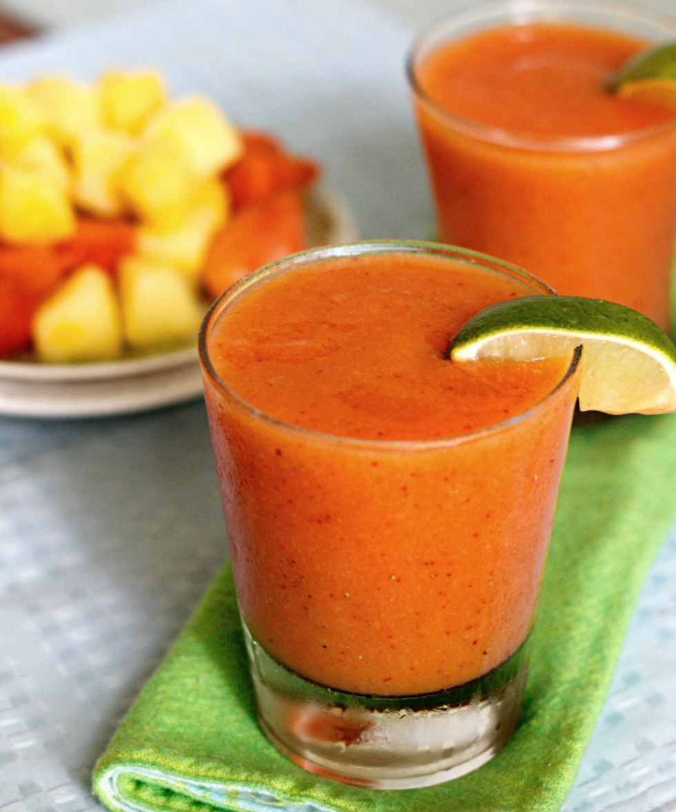 1. Tropical Papaya: Throw on some sunnies and sandals and kick back and relax with this fruit-packed frozen beverage. Replete with papaya, strawberries, pineapple and mango, this take is a great way to make your celebration feel more like a tropical vacation. (via Fabtastic Eats)
