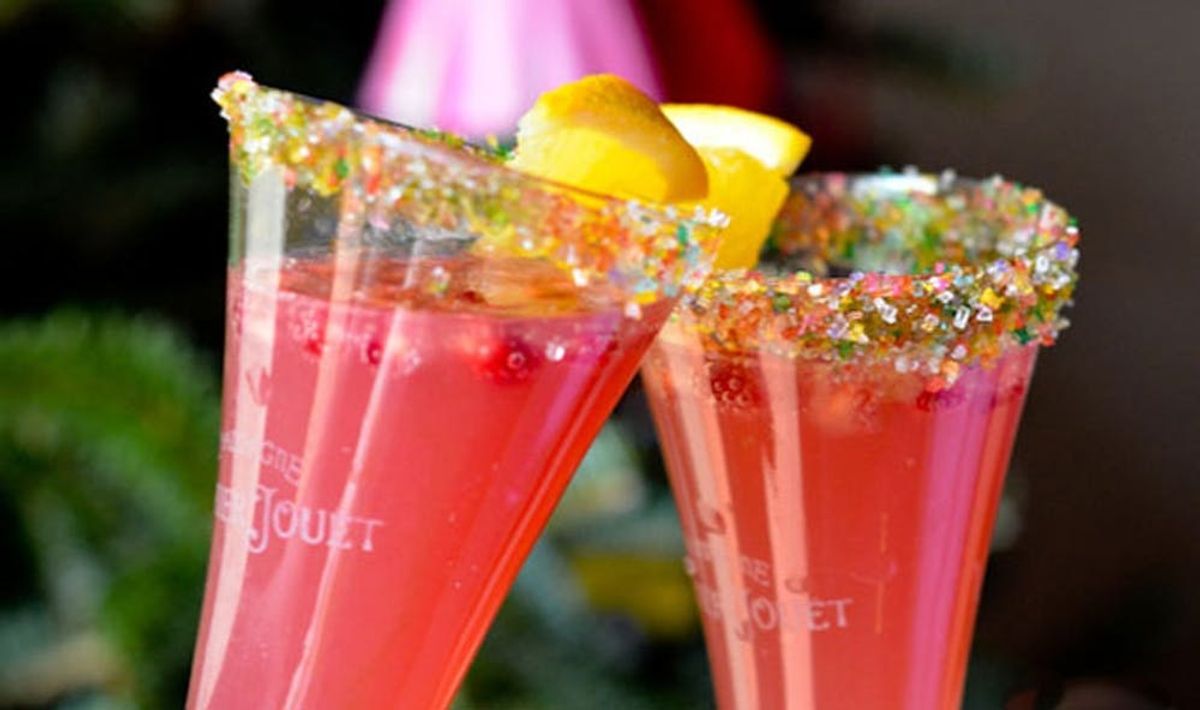 Pomegranate juice, orange liqueur, and the crowd-pleasing Prosecco come together in this seasonal libation, and to add a little sparkle we rimmed the glasses with sparkling sanding sugar, easily found in the baking aisle of your favorite store.