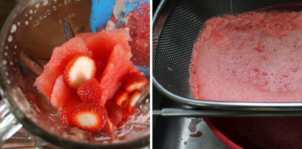 4. We combined watermelon, champagne, strawberries, and vodka in 3 rounds in the blender. Strain out the pulp.