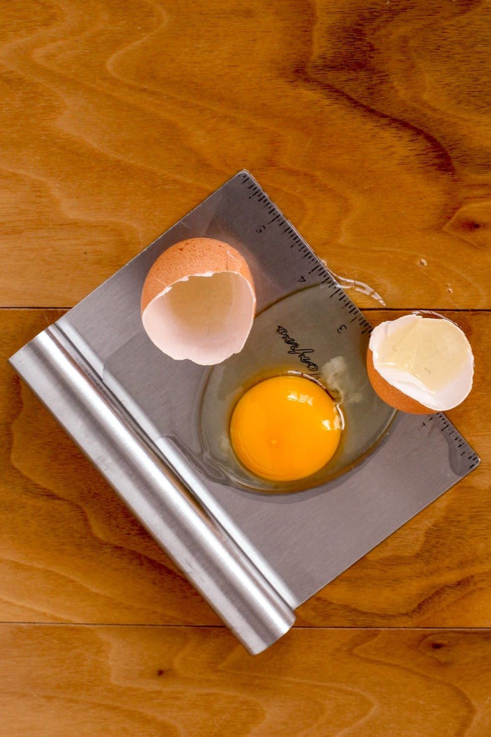 - Then, slide a bench scraper under the egg and any remaining shell bits. (Thin but sturdy, and with a large enough surface area to get underneath everything in one fell swoop, a bench scraper is the ideal tool for the task.)