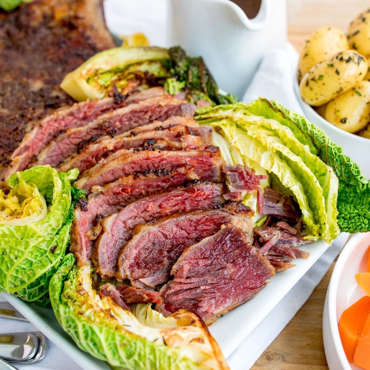 - Slice or shred the corned beef and serve on a large plate with the cabbage and gravy. Serve with carrots and potatoes too if you like.
