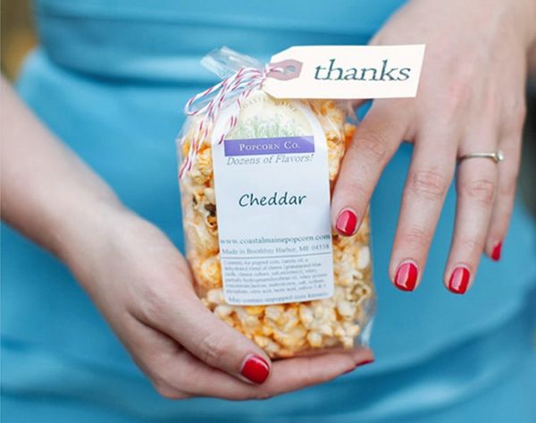 3. Popcorn: If your guests are the types to cut a rug for hours, give them the perfect snack to have after a long night of dancing. Creative varieties like chocolate or buffalo blue cheese will make it a really fun favor.