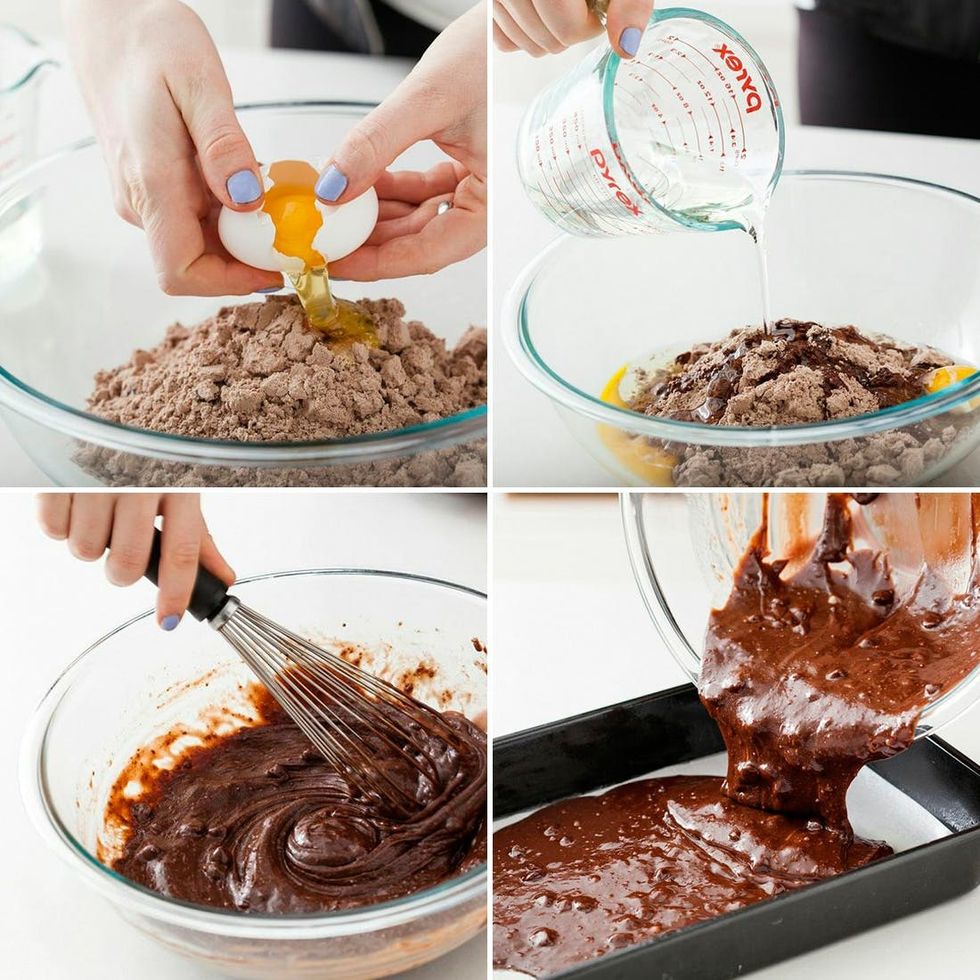 2. In a large bowl, combine brownie mix, eggs, water, and vegetable oil. Mix until combined. Spread in prepared pan.