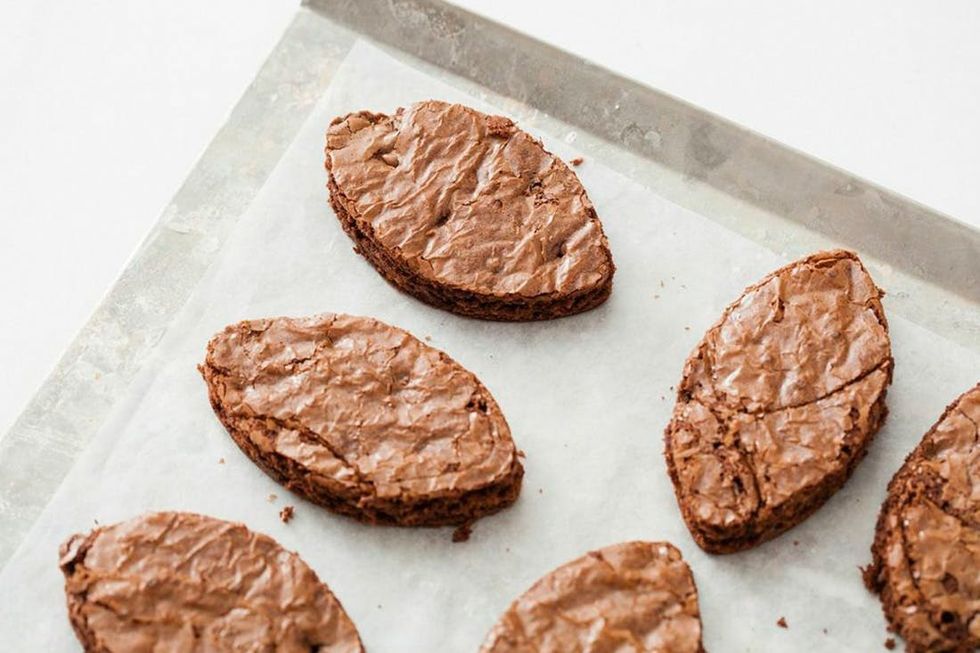 Use a football-shaped cookie cutter to cut out the brownies. Place them on a cookie sheet lined with wax paper.