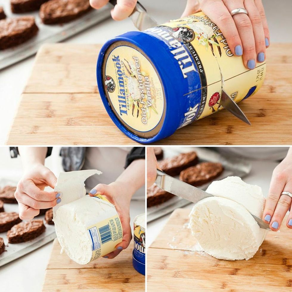 Remove the ice cream from the freezer. Using a sharp knife, cut the entire carton in half. Peel off the carton. Cut ice cream into 1/2-inch slices. You’ll have to work quickly so that the ice cream doesn’t melt.