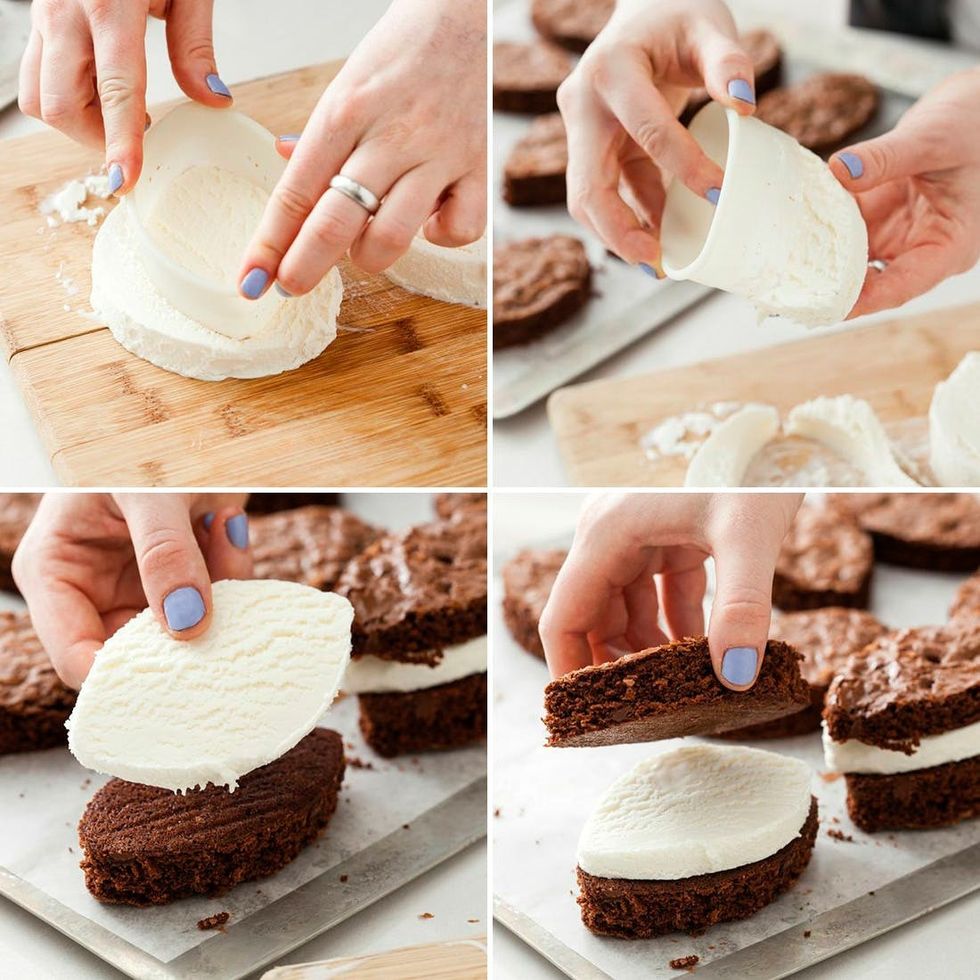 Cut into football shapes. Place cut-out ice cream between two cut-out brownies. Place sandwiches in freezer for 30-40 minutes.