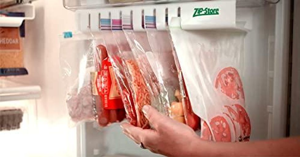 If you regularly pack lunches or leftovers in storage bags, check out this Zip N Store Holder to keep the bags from flopping around in your fridge. All your bags will slide along the rack, staying tidy and easy to see so they won't get lost and rot in the refrigerator.