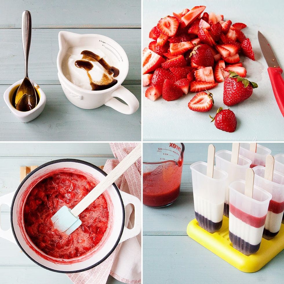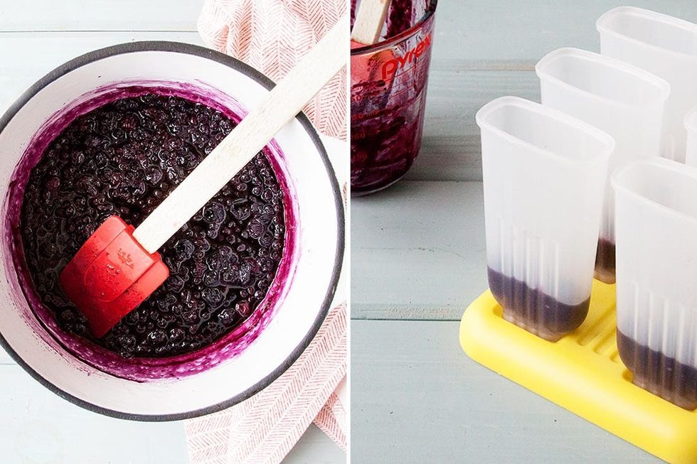 Build on that base with a layer of creamy vanilla yogurt and then sweetened strawberry puree — you’ll make that the exact same way you did the blueberry batch: Chop, add sugar, reduce and pour in! Toss the full molds (don’t forget the sticks!) into the freezer until the popsicles are solid.