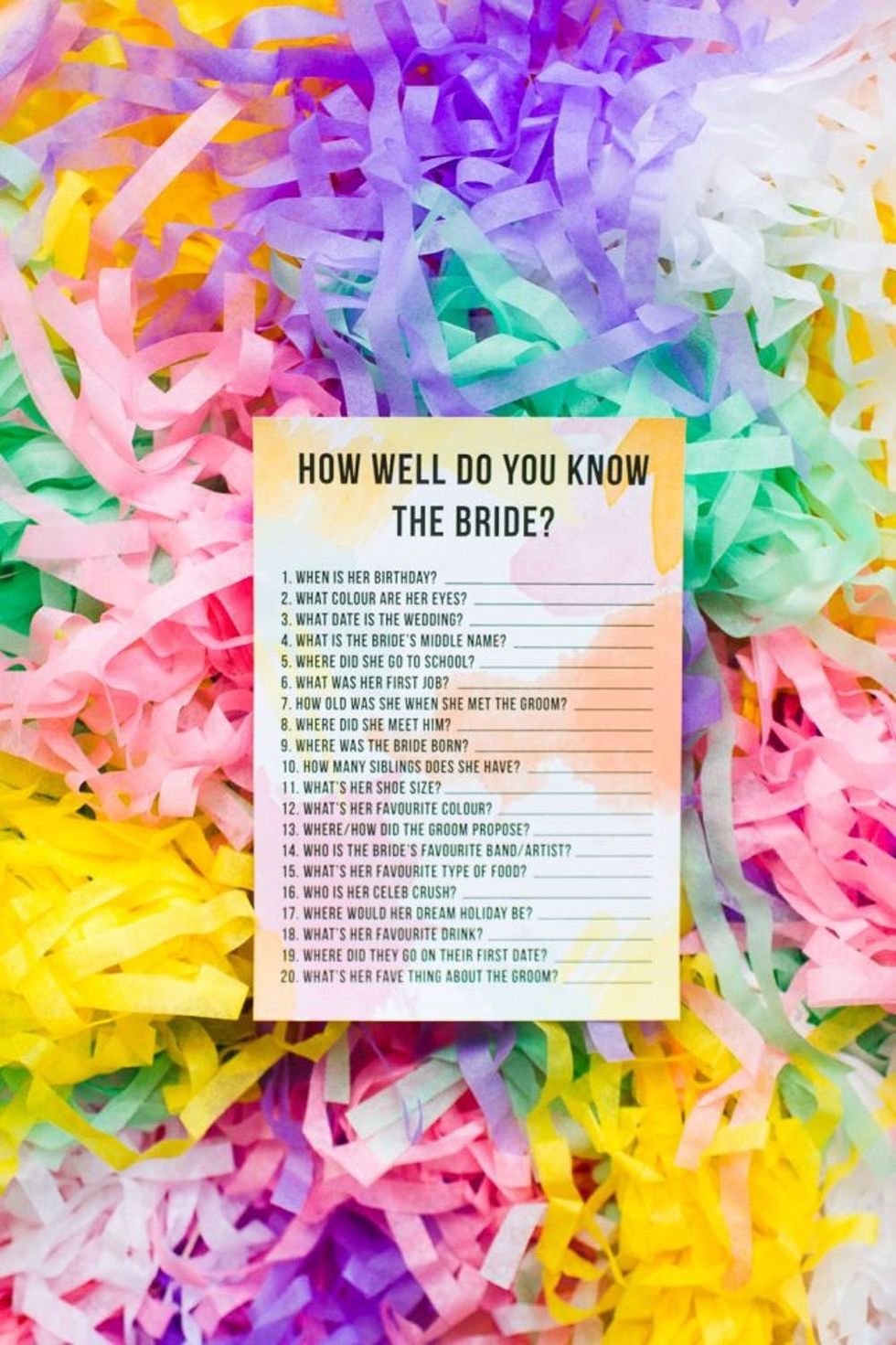 For the “Groom Said What?” ask the lucky guy beforehand to answer all of the questions on the sheet and then test the bride at the party to see if she knows how he answered.