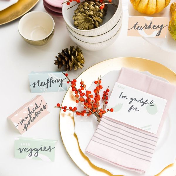 With Thanksgiving less than a week away, T-Day preparations are in full swing. Before you freak out, know that we’re here to save the holiDAY with easy recipes, cocktail ideas and fun games for you and your fam. And you better believe we’ve got you covered on the Turkey Day decor front too. Case in point: these modern and colorful Thanksgiving tablescape printables from our Free Printable Friday series. Pair ’em with a unique color palette and some downright delicious dishes and you’ll have the most Instagram-worthy tablescape in all the land.