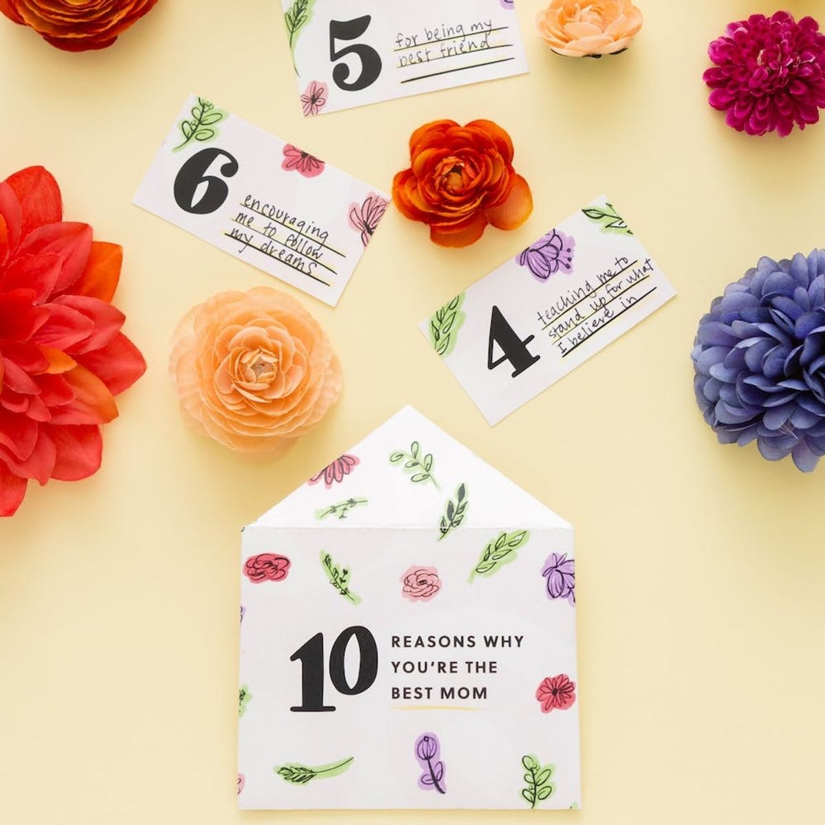 Simply print out the envelope and cards, cut, and get your list of why she’s the best mom ever going. We recommend writing them all out on paper before putting them on the cards. But, if you do make a little mistake, you can always print another set of cards.