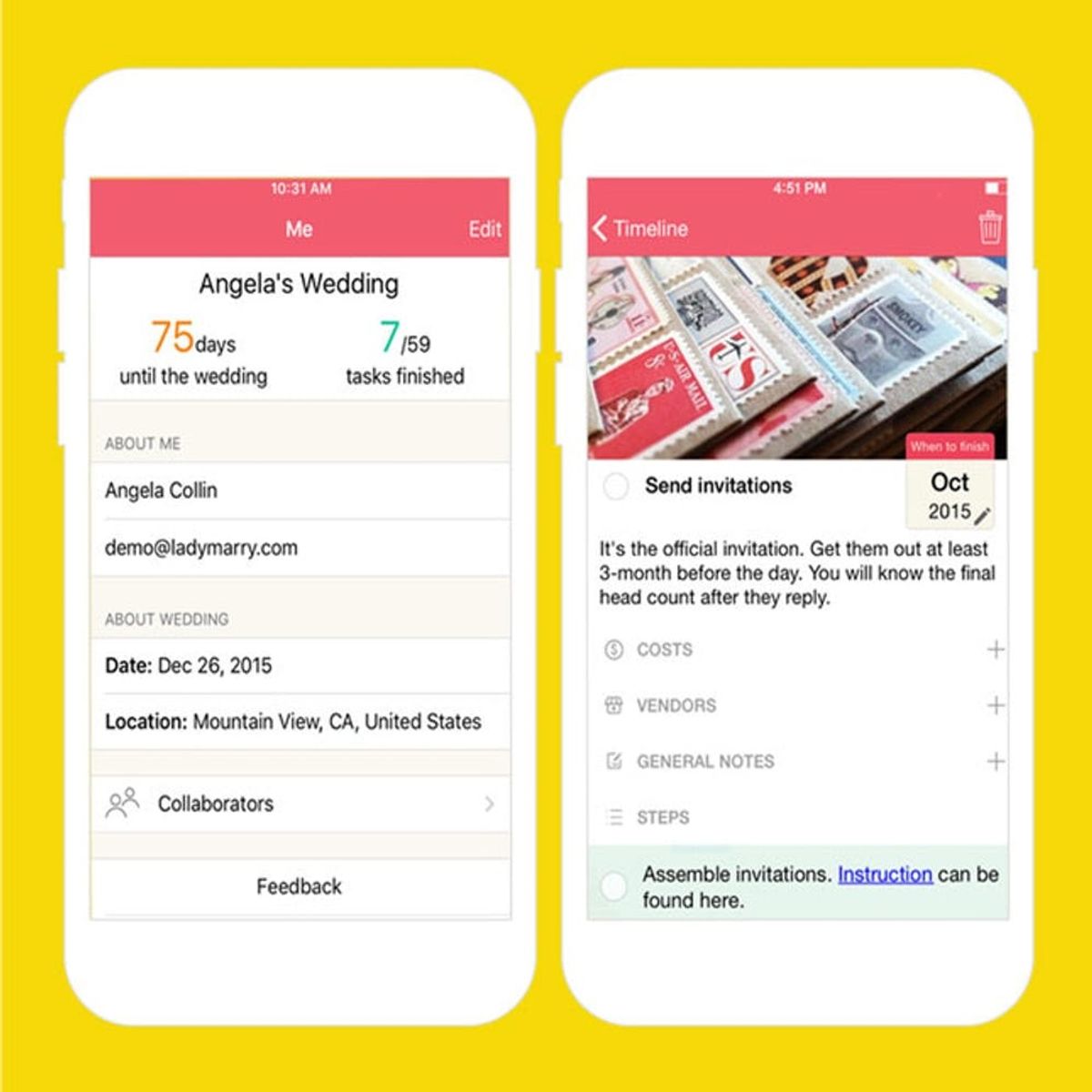 4. Collaborate. Here’s the feature that pushes this app to over-the-top amazing. Sometimes the most stressful part of wedding prep (even with all the resources, apps, and planners in the world) is keeping friends, family, and your spouse-to-be on the same page. LadyMarry encourages you to connect, connect, connect! You can even add your vendors to the in-app conversations so the flow of communication is continual and stress-free.