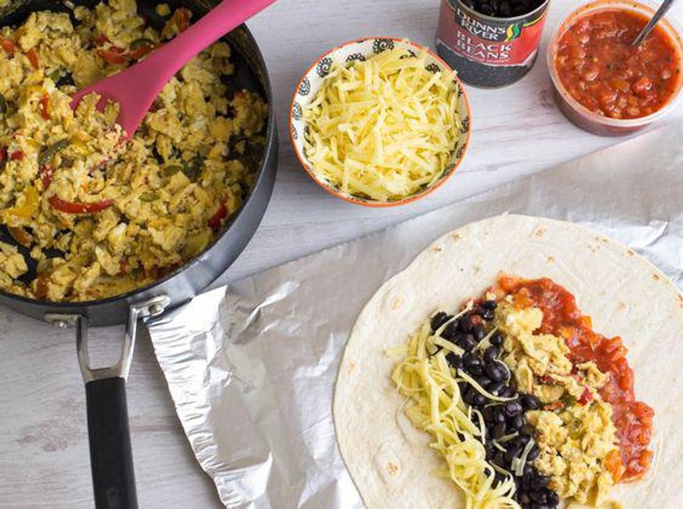 Fold in two edges of the burrito, then roll tightly. Wrap securely in the foil and repeat with the remaining ingredients to form six burritos. Place them in a freezer bag and freeze.