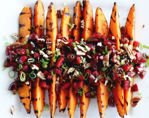 19. Grilled Sweet Potatoes With Cherry Salsa: How stunning are these bright orange potato wedges topped with chopped cherries, pecans, green onions and ginger?! Each bite is a playful mix of sweet and savory. (via The First Mess)