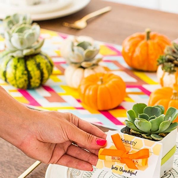 2. Create Cute Place Cards: You want your guests to feel special from the moment they arrive. Create place cards that include a little gift. We teamed up with Burt’s Bees to create these punny and cute place cards that say things like “Bee Thankful” and feature Vanilla Bean, Coconut & Pear, Beeswax and Pomegranate Lip Balm flavors. Yum!