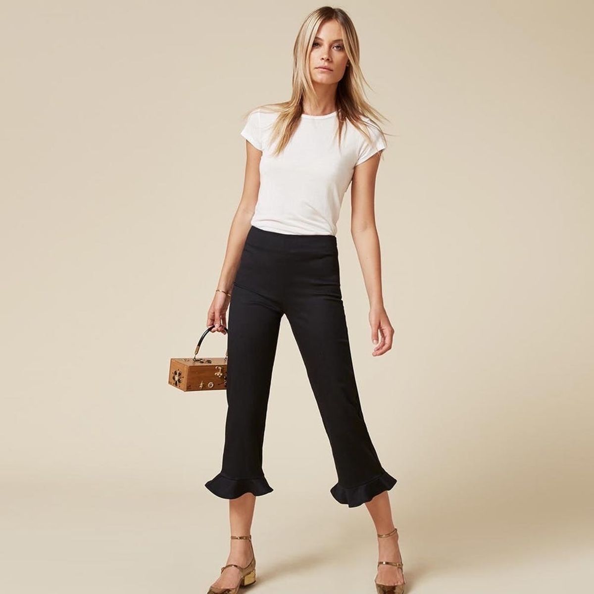 You’re regularly on the prowl for ways to inject major pep into your step — maybe it’s a little extra dazzle from your glitter-flecked chunky-heeled shoes, or perhaps it’s your pastel-hued cocoon coat that’s working overtime to deliver on the style front. Either way, we’ve uncovered the latest head-turning pant trend. This is NOT a drill: You need to run — don’t walk — to snatch up a pair of the season’s most coveted frilly hem crop trousers. Not only are they ridiculously playful (think of them as the exclamation point to every polished #OOTD), but you can actually rock them in the boardroom without any side eye from HR. Can we get an amen? Ahead, we’ve compiled 15 pairs of boss babe-approved trousers that are more than deserving of a spot in your lazy girl capsule wardrobe, ‘cause they’re just that dang comfortable.