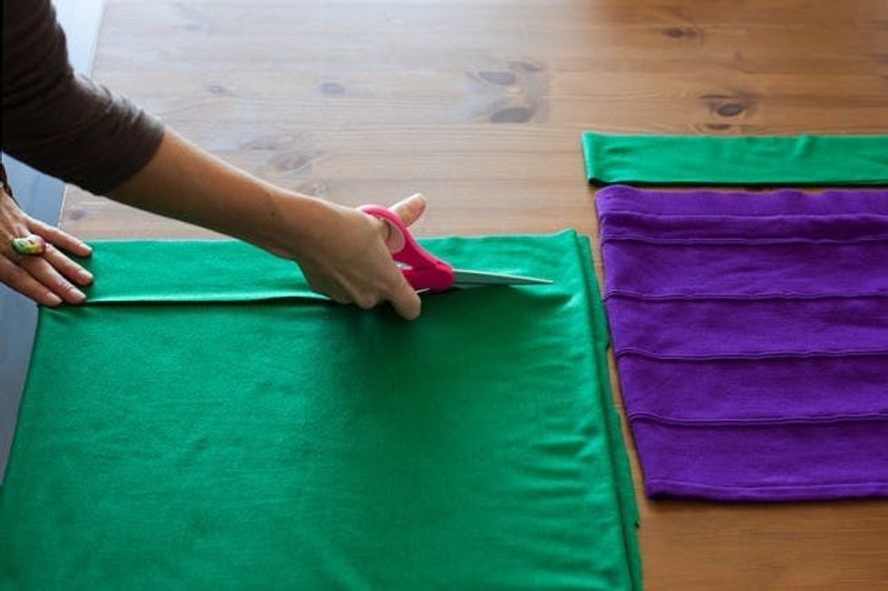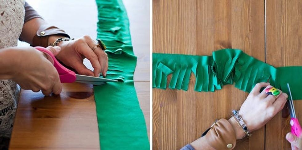 Once you have your strips, it’s time to cut the fringe. Cut 1/4 or 1/2 inch sections, depending on how much fringe you want. Make sure not to cut all the way to the top!