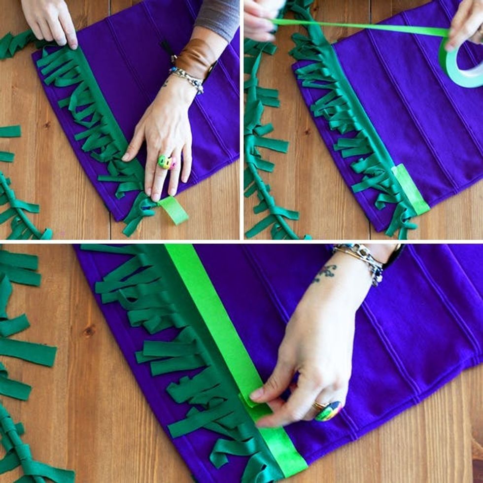Now, to make sure you sew your fringe on straight it’s time to bust out some painter’s tape. Tape your fringe along so that it’s straight. You only want to cover the edge just barely.