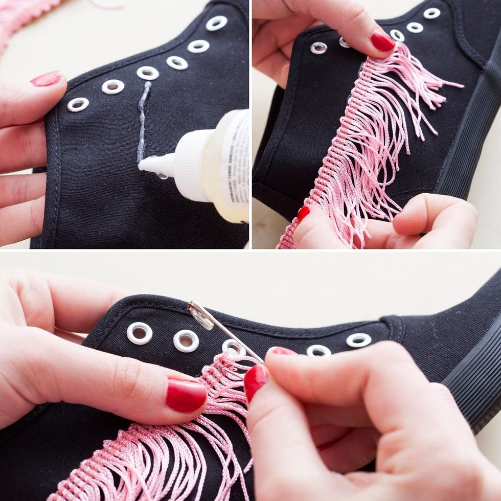 3. Glue fringe to sneaker. Secure with a pin until glue dries.