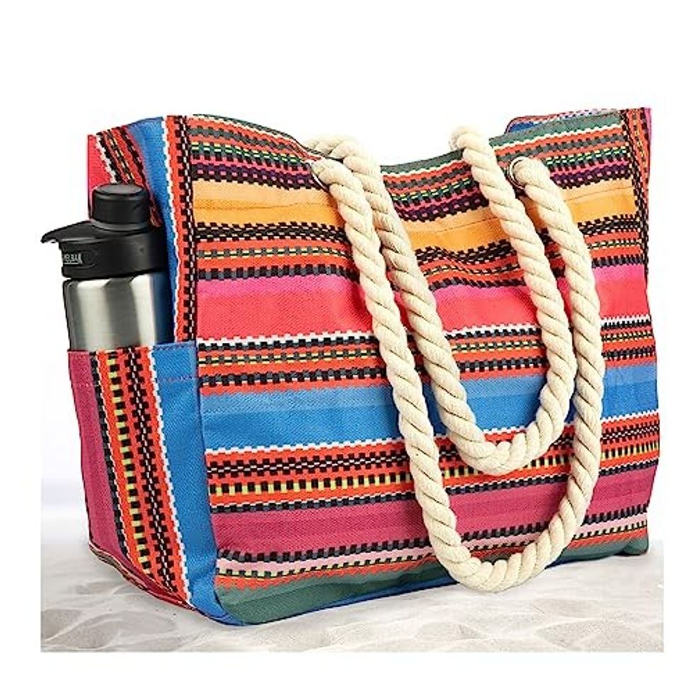 Getting everything you need to your perfect beach spot can be a hassle — but that's only part of the reason we love this beach tote. Not only is it massive and easy to carry, but it's also made of waterproof and sand-resistant material to keep everything inside nice and safe. Also, the side pockets make reaching essentials like your water, phone, and keys a breeze.