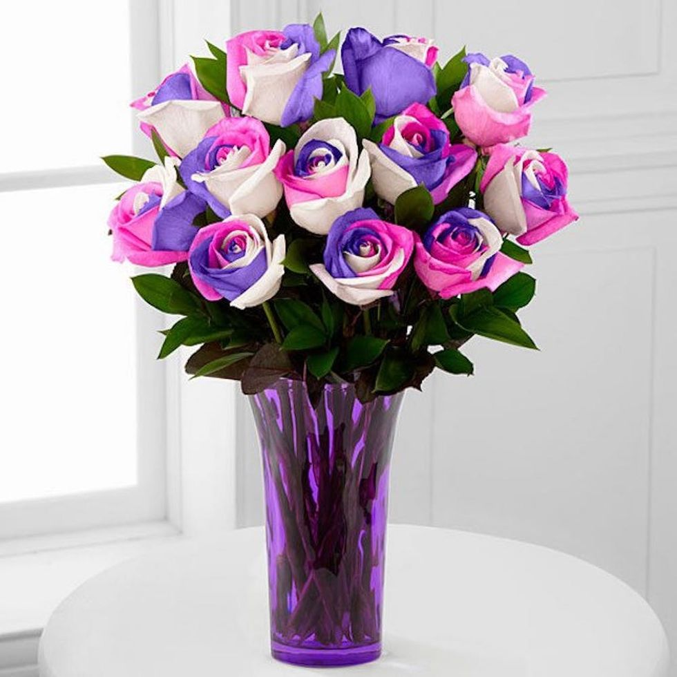The roses come in a bouquet of six with a vase ($30), 12 roses without a vase ($50), 12 roses with a purple vase ($60), or 24 roses with a vase ($110).