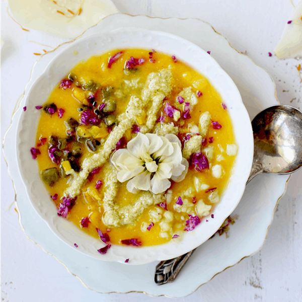 6. Yellow Gazpacho With Roasted Poblano Pesto: This soup is straight out of a culinary fairy tale. Yellow tomatoes and yellow bell peppers give this broth its deep golden color and diced vegetables used as garnish offer fantastic textures. The roasted poblano pesto pulls everything together perfectly. (via CaliZona)
