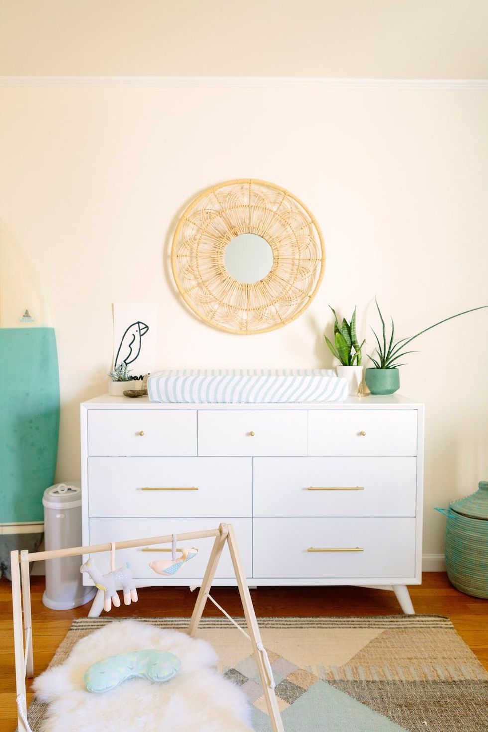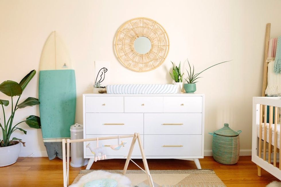 The changing table area was made so much sweeter with this rattan mirror from World Market. To add a more playful and personal look to the zone, I picked up a parrot sketch from local artist Daniel Garzi and a three-toned teal surfboard shaped by a good friend of ours.