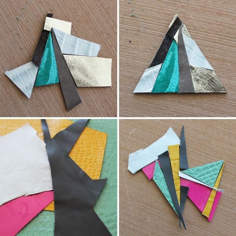 We happened to have a bunch of leather, pleather, and vinyl fabric scraps in our arsenal. If you’re looking for scraps, try craft stores in the scrapbooking section. They often have small pieces in bags that are just a few dollars per bundle. Etsy also has tons of leather scrap bundles.