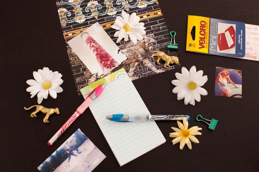 – To pin up: fake flowers, gold animal toys, magazine cut outs, photos, a notepad