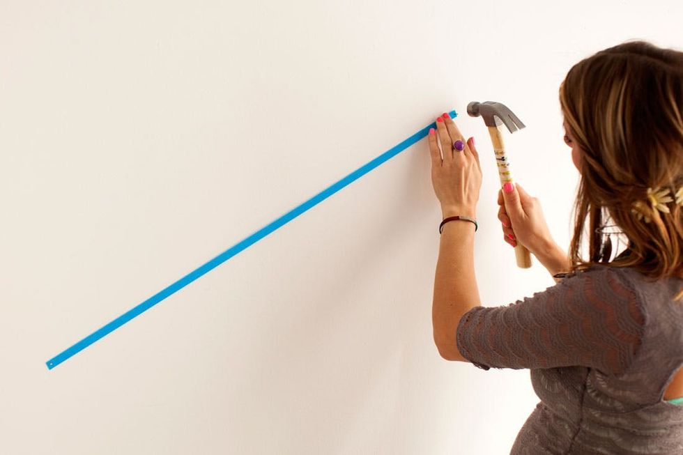 Use a hammer and nail to attach it to the wall, and angle it however you like and nail at the other end.