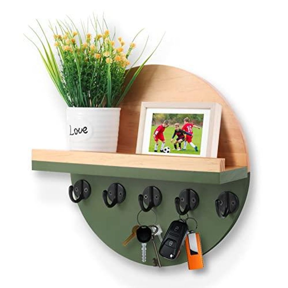 Transform your entryway with this fashionable wall mount, the perfect accessory for organizing your everyday essentials. From your keys, to your umbrella, dog leash, and coats, this two-tone design will have your door looking chic and stylish. Don't miss out on this must-have for your home.
