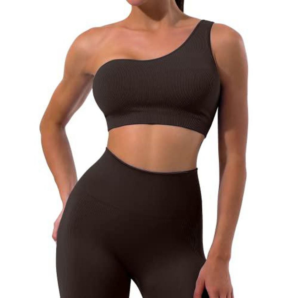 Embrace your inner athlete in this matching workout set that you can rock all summer long. This 2 piece set comes with a one-shoulder ribbed sports bra and matching seamless leggings. This breathable and lightweight set makes it easy to look sporty, stylish and comfortable while trying to achieve that "clean girl aesthetic." Throw on some sneakers and a button down after the gym to continue the trendy look.