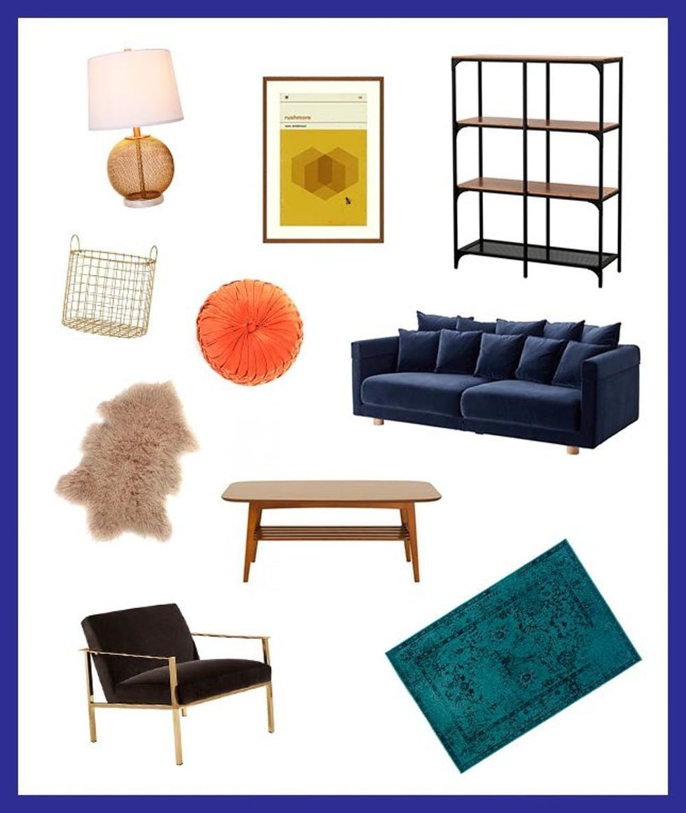 Cupcakes and Cashmere Mesh & Marble Table Lamp ($150), Concepcion Studios Wes Anderson Inspired Poster ($50), IKEA FJÄLLBO Shelf Unit ($99), IKEA STOCKHOLM 2017 Sofa ($1299), Lulu & Georgia Lars Coffee Table ($302), Lulu & Georgia Kuma Rug ($90+), CB2 Cue Chair With Brass Legs ($649), Rockwall Mongolian Single Sheepskin Faux Fur ($90), Urban Outfitters Round Pintuck Pillow ($39), Room Essentials Decorative Gold Wire Bin ($20)