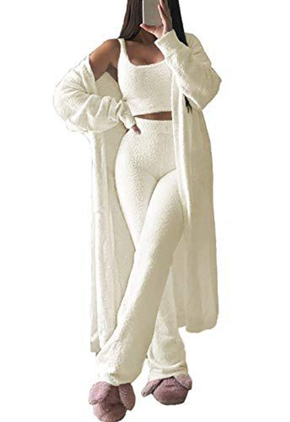 Even the "it" girls keep the aesthetic going while they lounge around the house. By throwing on this 3 piece fuzzy set while lounging around the house or doing errands around town, you can keep yourself both chic and comfortable. This set comes with a fuzzy cardigan, stretchy tank top, and loose-fitting pants that all match together to create the most adorable, comfortable outfit.