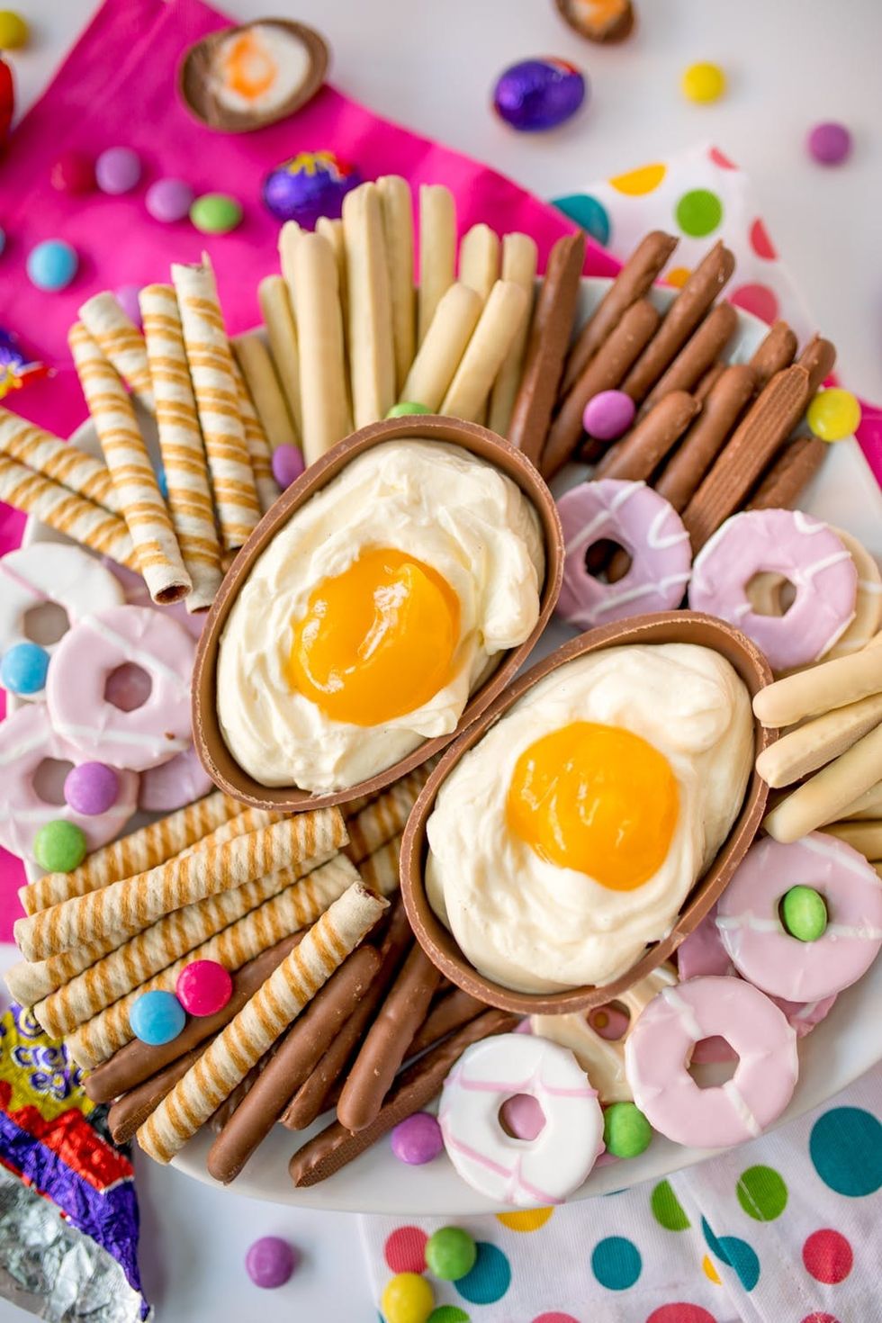 - Scatter cookies and candies around the giant creme egg before serving.
